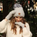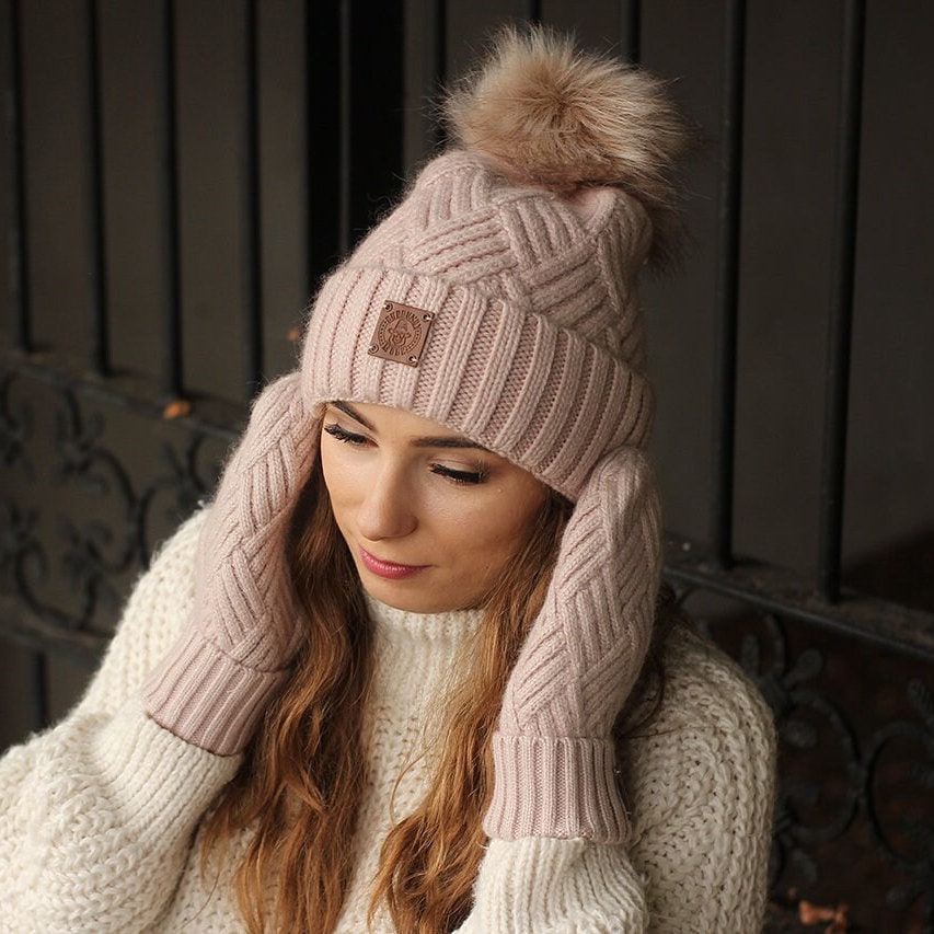 Set aus Kaschmirmütze und Fäustlingen für Damen, Kaschmirmütze mit Kunstpelzbommel, warmes und weiches Winter-Kaschmirset für Damen. Geschenk für sie.
