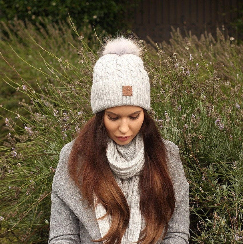 Kaschmir-Set für Damen: Mütze mit Fuchspelz-Pompon, Handschuhe, Schal, Strickset, gemütliches und weiches Winter-Kaschmir-Set für Damen. Geschenk für sie.