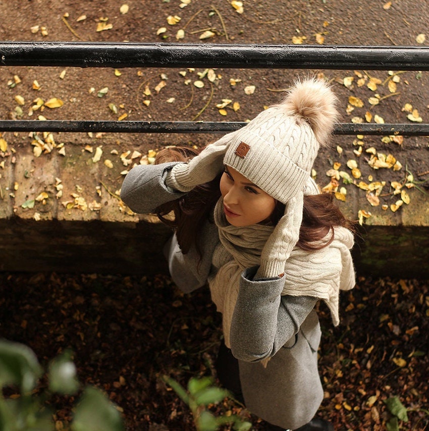Kaschmir-Set für Damen: Bommelmütze, Handschuhe, Schal, Strickset, gemütliches und weiches Winter-Kaschmir-Set für Damen. Geschenk für sie.
