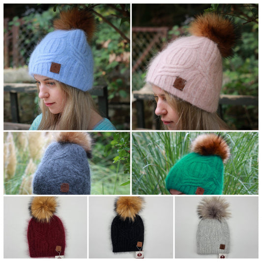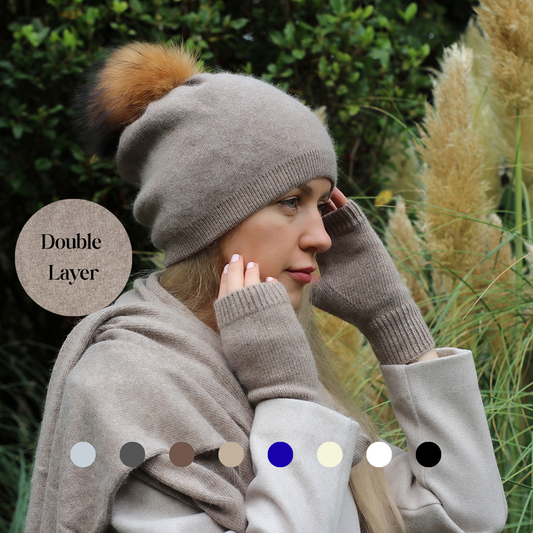 Bonnet chaud en cachemire pour femme avec pompon en fourrure de renard – Bonnet d'hiver doux, cadeau idéal pour elle