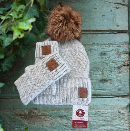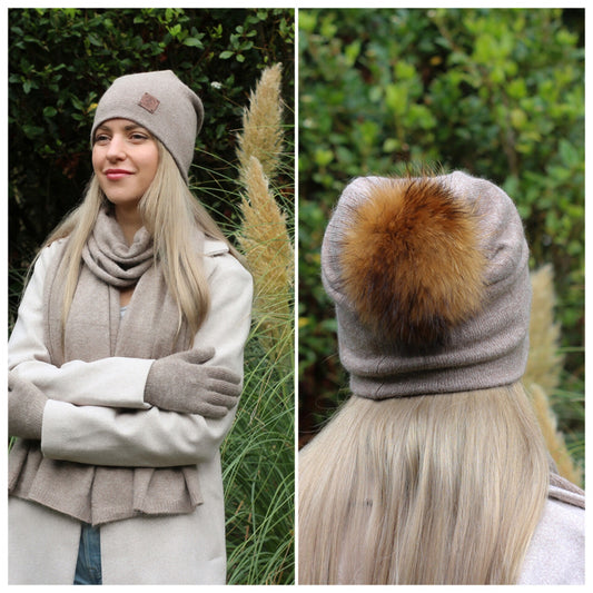 Ensemble bonnet et mitaines en cachemire, bonnet en cachemire avec pompon en fourrure de renard, ensemble en cachemire d'hiver chaud et doux pour femme. Cadeau pour elle