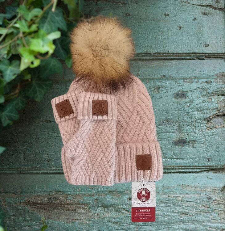 - Ensemble bonnet à pompon et gants sans doigts en fils de cachemire épais