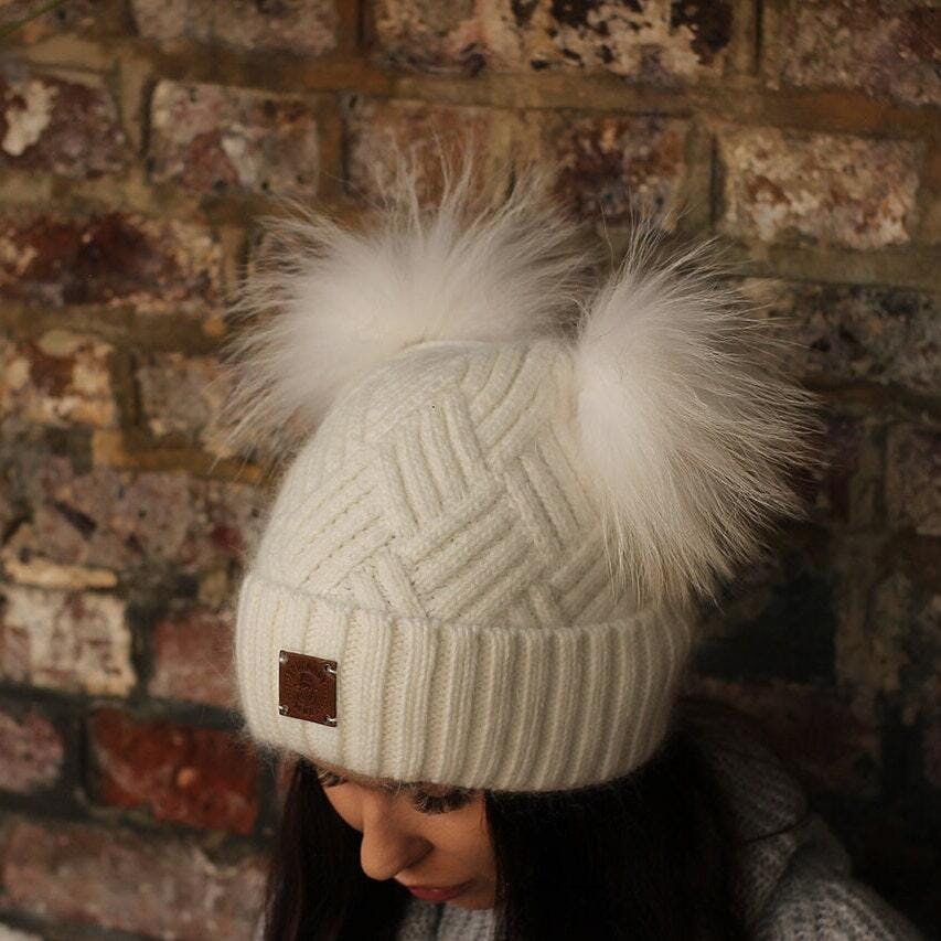 Cashmere double fox fur pom pom hat, Cozy and warm women's girl's bobble beanie, Gift for her